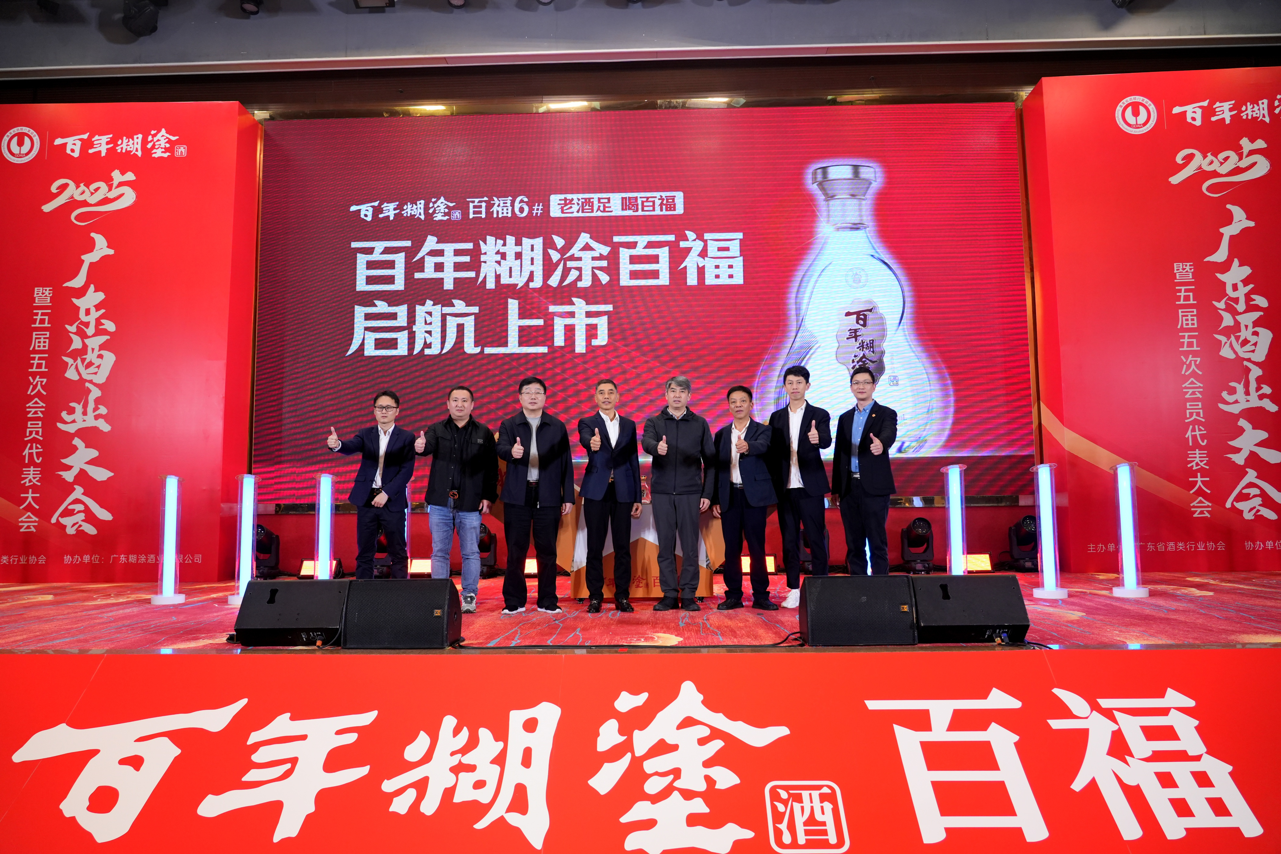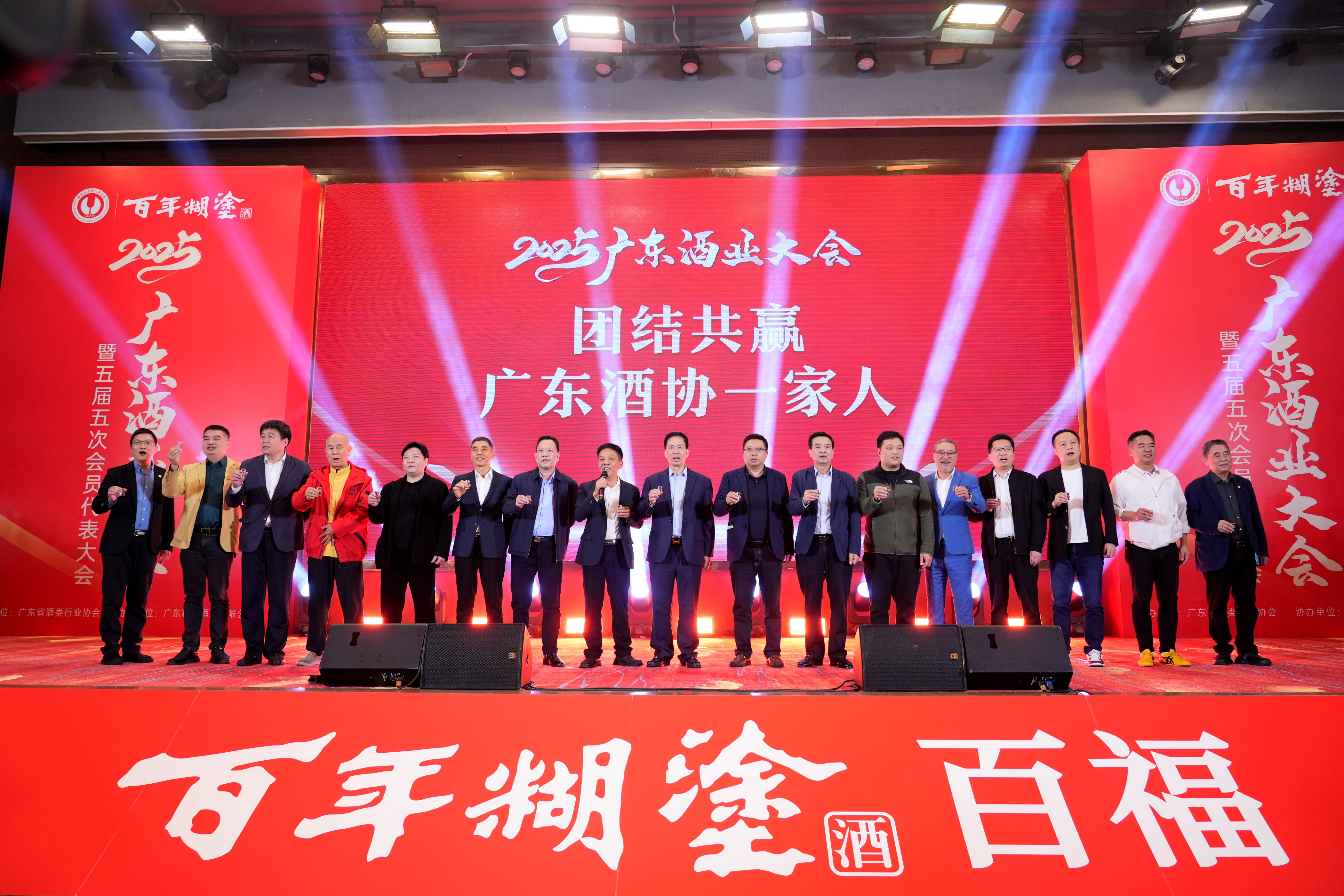 啟動儀式后,廣東酒業(yè)協(xié)會的17位領(lǐng)導(dǎo)出席祝酒儀式,用百福6#共同舉杯,慶賀2025廣東酒業(yè)再接再厲,再創(chuàng)輝煌。